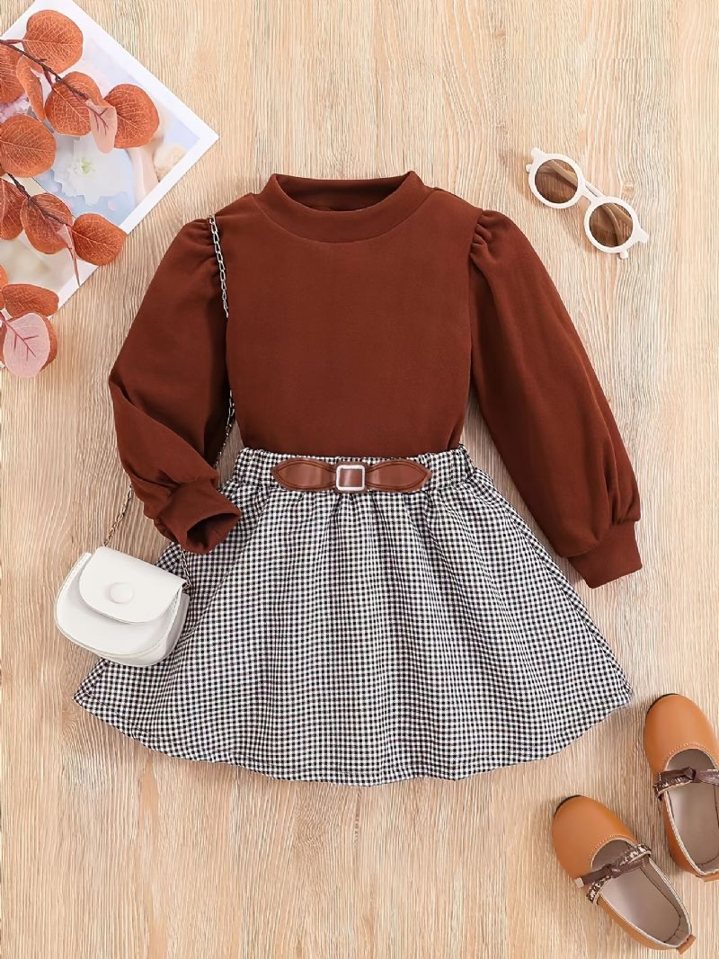 Bebis Flickor Långärmad Höghalsad Topp & Rutig Kjol Set Barnkläder
