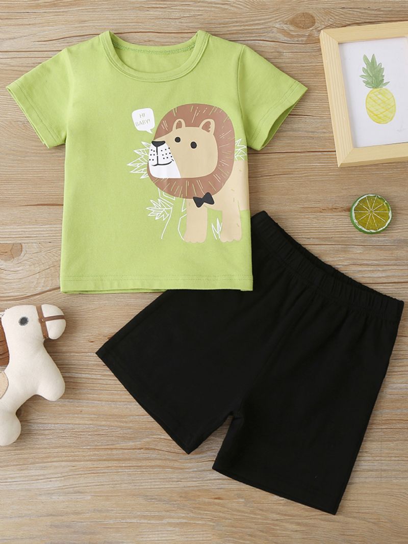 Bebis Pojkar Casual T-shirt Med Tecknad Lejontryck Och Solida Shorts