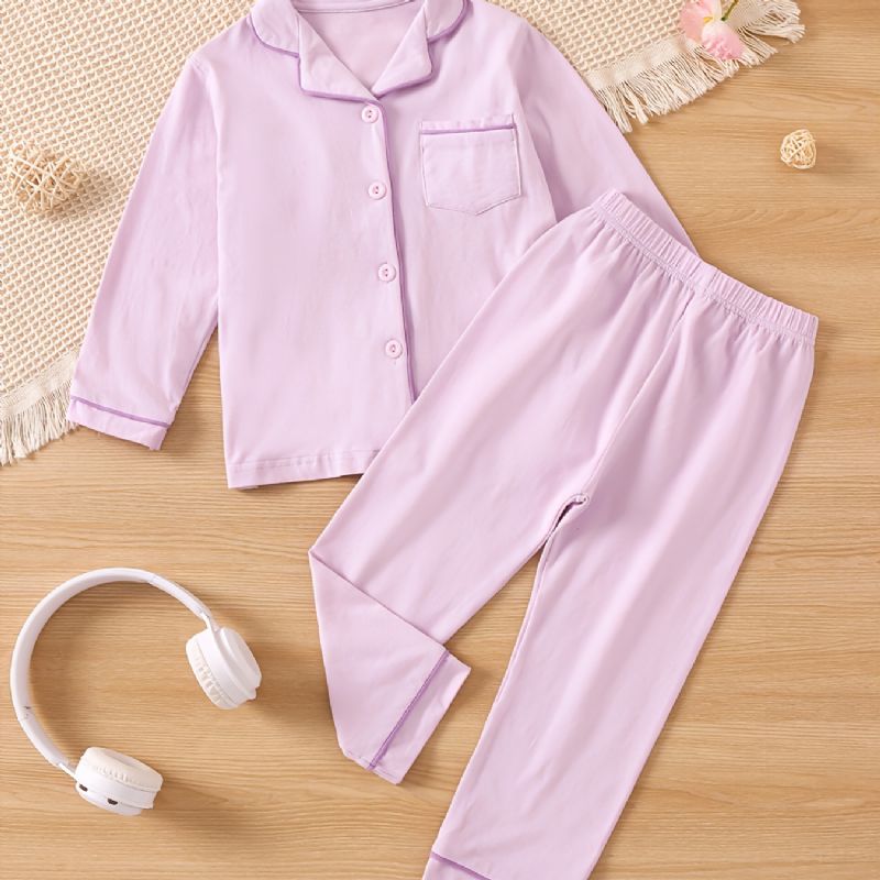 Höst Vinter Barn Enfärgad Lapel Långärmad Byxa Pyjamas Set